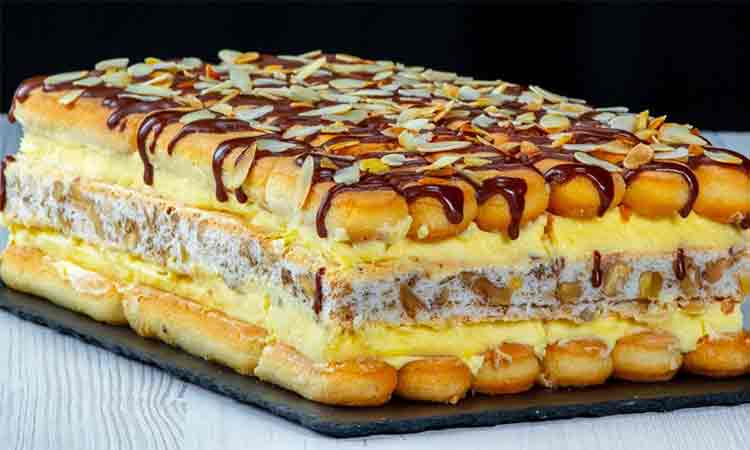 Într-un bol, turnați 100 ml de lapte și înmuiați ciascărți de piscoturi sau biscuiți. Aranjați un strat în tava de copt, apoi adăugați un strat de cremă. Așezați blatul deasupra, ungeti cu crema rămasă și adăugați un nou strat de piscoturi înmuiate în lapte. Lăsați desertul la frigider pentru 1 oră.